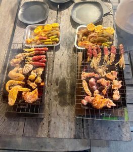 Phần món chính là điểm nhấn của bữa tiệc với sự đa dạng phong phú. Các món đặc sản không thể thiếu bao gồm: cá lóc nướng trui – đặc sản vùng sông nước miền Tây, được tẩm ướp với gia vị đặc trưng và nướng trên than hồng; gà ta hấp nước mắm thơm phức với lớp da vàng giòn rụm; tôm sú hấp bia tươi ngon từ các trại nuôi tại Bạc Liêu; và các món nướng BBQ đa dạng như sườn heo, vú heo nướng, chân gà, cánh gà, ba chỉ cuộn nấm kim châm, tôm, bạch tuộc, và rau củ quả nướng.
